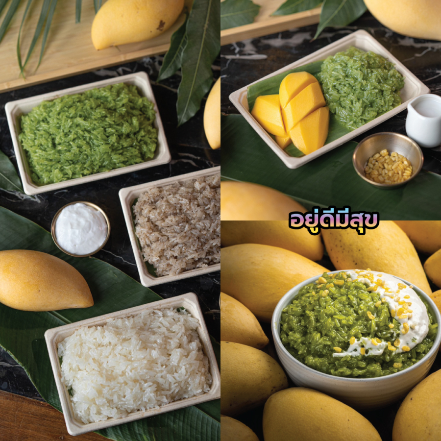 ร้านอยู่ดีมีสุข เมนูข้าวเหนียวมะม่วง ข้าวเหนียวเมล็ดสวยอวบอ้วนมูนกับน้ำกะทิใบเตยหอมฉ่ำมันวาว กินพร้อมมะม่วงสดใหม่ส่งตรงจากสวนอัมพวา และกะทิเนื้อข้นจากหัวกะทิแท้