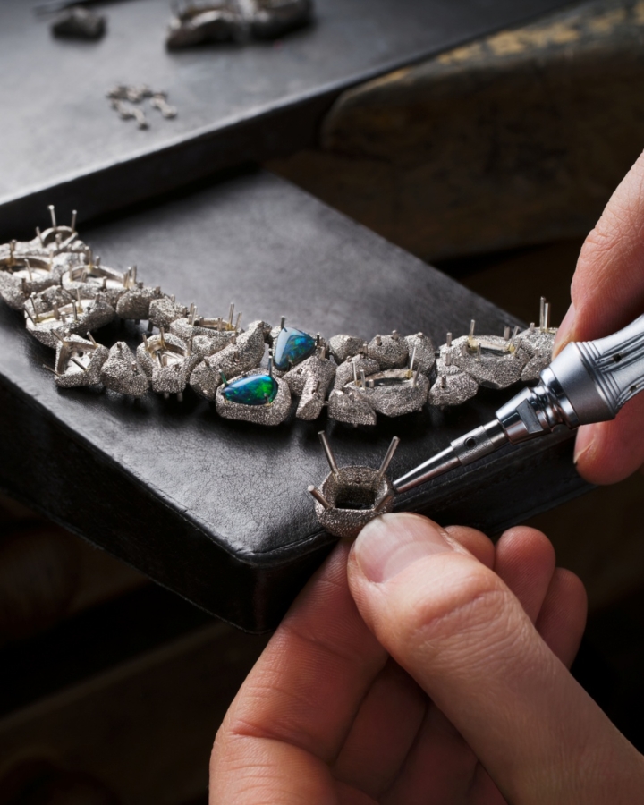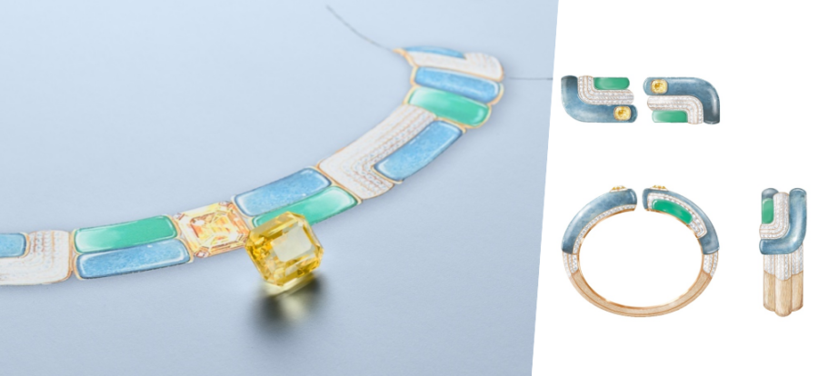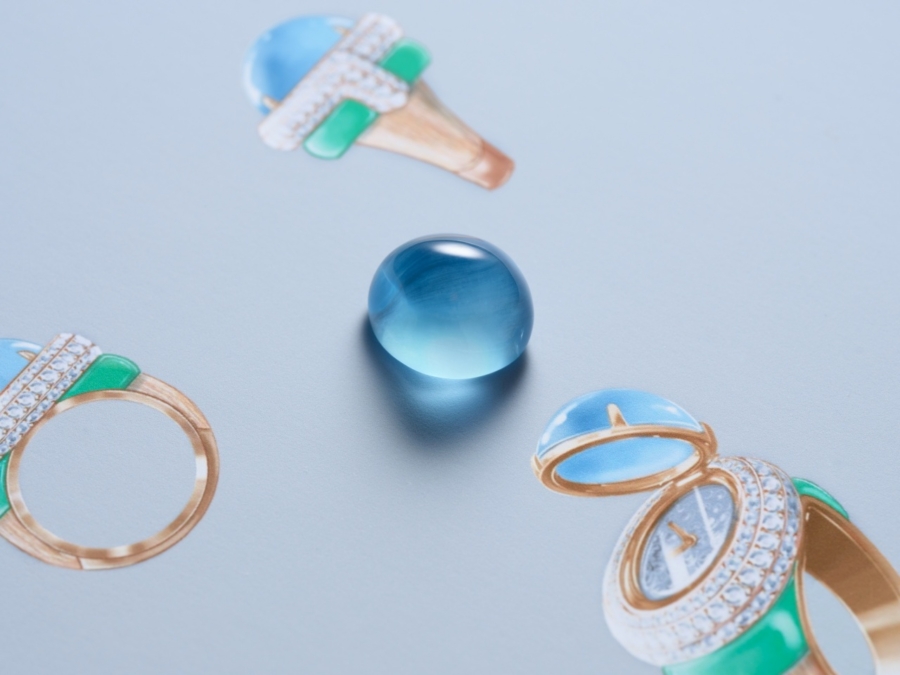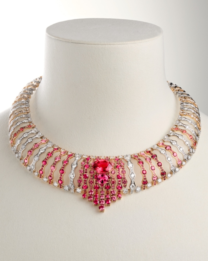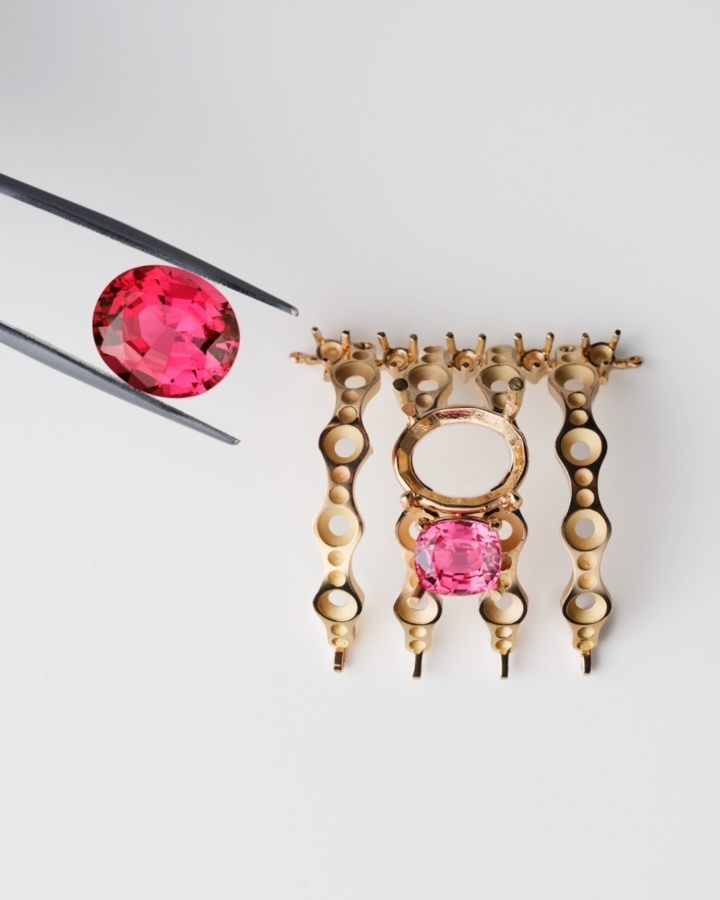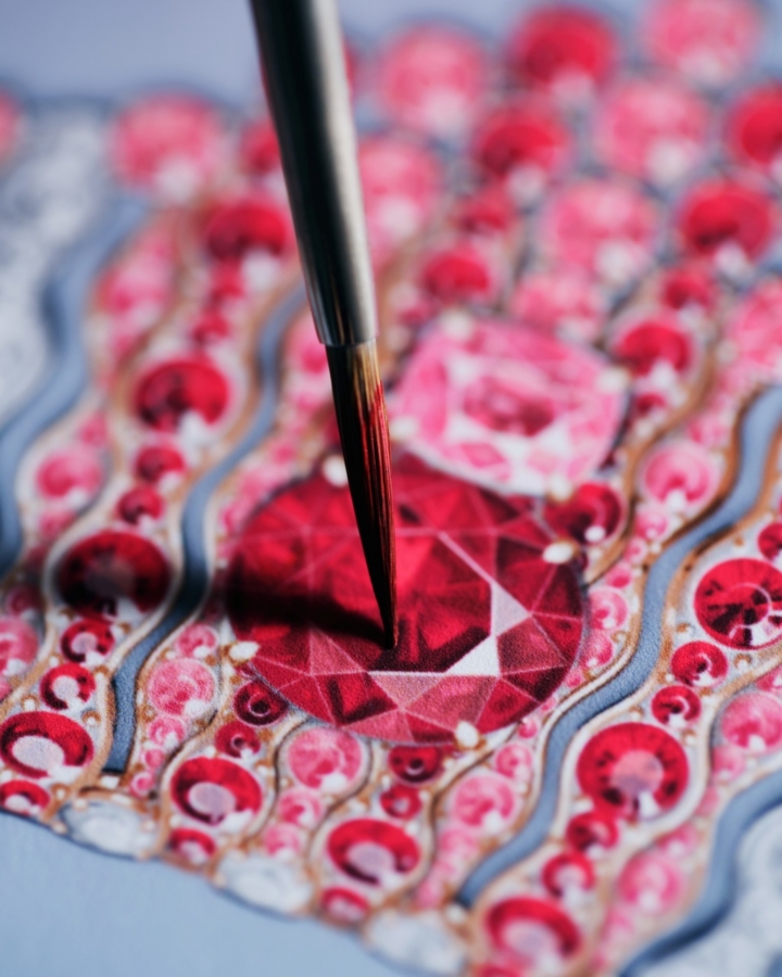 อัญมณีล้ำค่าทั้งหลายที่ผ่านการคัดสรรด้วยความเชี่ยวชาญ ไม่เพียงเพื่อให้ได้มาซึ่งความสวยงามและความหาได้ยากยิ่งเท่านั้น แต่หัวใจสำคัญไม่แพ้กัน คือ เพื่อให้ได้มาซึ่งอัญมณีที่มีคุณค่าทางศิลปะ เข้ากันได้เป็นอย่างดีกับธีมของเครื่องประดับแต่ละชุด ไปจนถึงมีบทบาทในการจัดองค์ประกอบที่สำคัญ ทั้งในแง่ของสีสัน แสง และรูปทรง ดังเช่น สปิเนลสีแดงและสีชมพูอมส้มอันหายาก ที่งดงามโดดเด่นเป็นจุดศูนย์กลางของเครื่องประดับชุด Wave Illusion