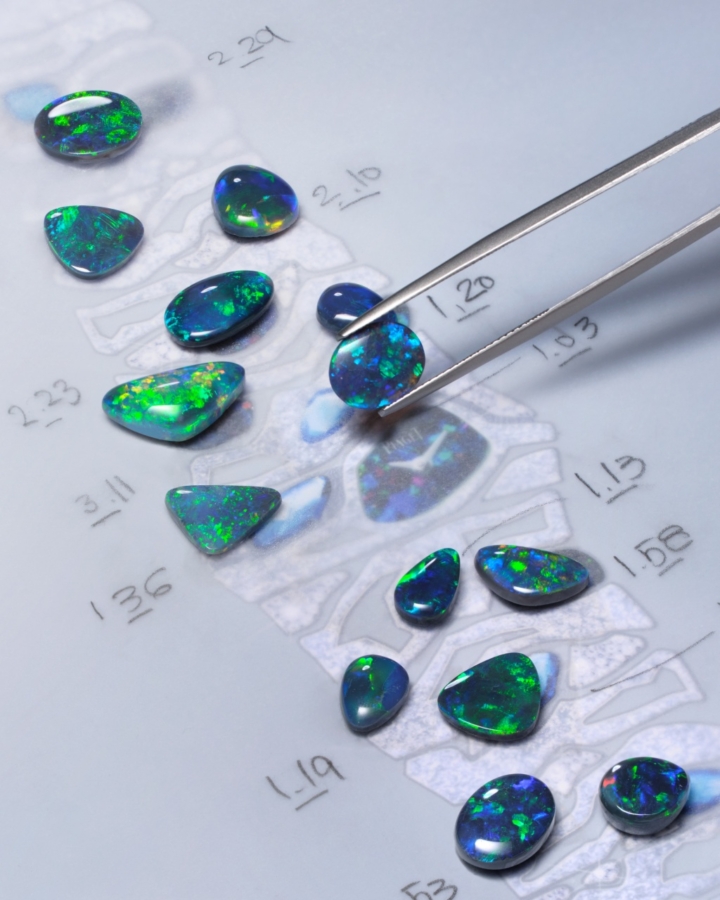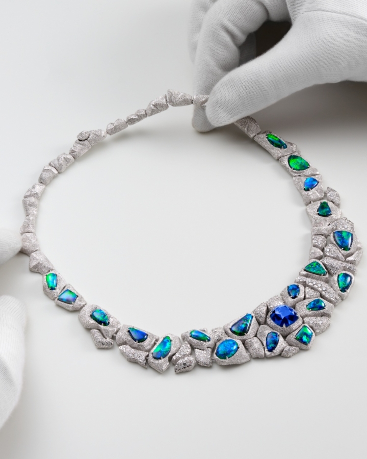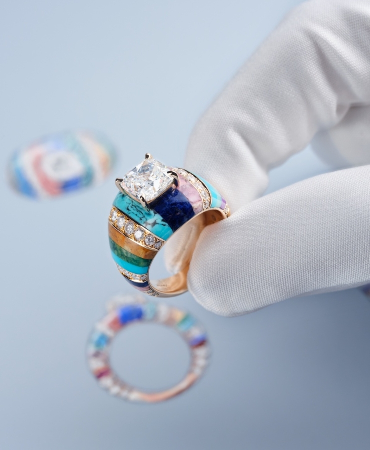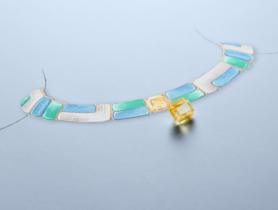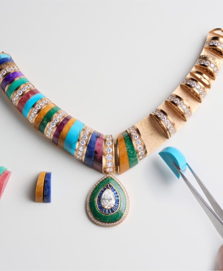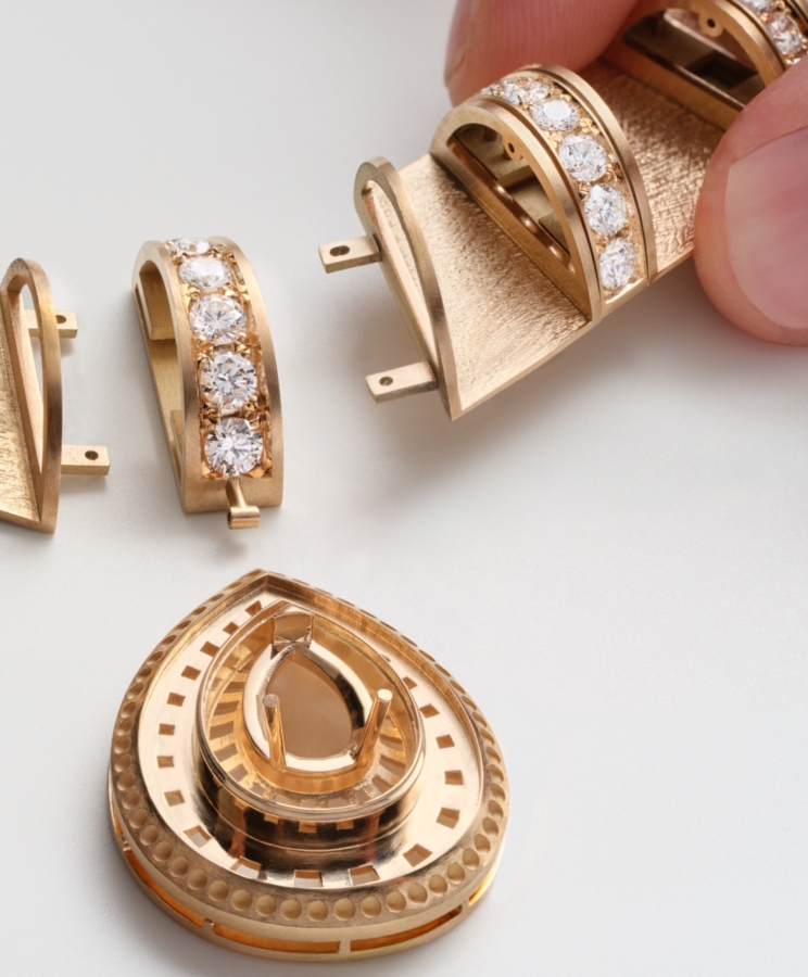 อัญมณีล้ำค่าทั้งหลายที่ผ่านการคัดสรรด้วยความเชี่ยวชาญ ไม่เพียงเพื่อให้ได้มาซึ่งความสวยงามและความหาได้ยากยิ่งเท่านั้น แต่หัวใจสำคัญไม่แพ้กัน คือ เพื่อให้ได้มาซึ่งอัญมณีที่มีคุณค่าทางศิลปะ เข้ากันได้เป็นอย่างดีกับธีมของเครื่องประดับแต่ละชุด ไปจนถึงมีบทบาทในการจัดองค์ประกอบที่สำคัญ ทั้งในแง่ของสีสัน แสง และรูปทรง ดังเช่น สปิเนลสีแดงและสีชมพูอมส้มอันหายาก ที่งดงามโดดเด่นเป็นจุดศูนย์กลางของเครื่องประดับชุด Wave Illusion