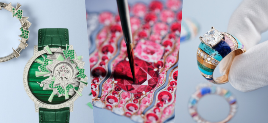 ในส่วนของนาฬิกากำไลข้อมือสองเรือนจากชุด Joyful Twirls ที่มีสายกำไลข้อมืออันพริ้วไหวอ่อนนุ่มและลวดลายแวววาว เต็มไปด้วยความมีชีวิตชีวาจากสีสันของอัญมณีที่ปูประดับด้วยเทคนิค Pavé โดยนาฬิการุ่นแรกประดับด้วยแซฟไฟร์สีน้ำเงินเข้มในสองเฉดที่ให้ความรู้สึกลึกลับ ในขณะที่นาฬิกาอีกรุ่นแต่งแต้มในโทนสีส้มจัดจ้านจากสเปซซาร์ไทต์การ์เนตและแซฟไฟร์สีชมพูที่ตัดกันอย่างเจิดจ้า กำไลข้อมือได้รับการตกแต่งพื้นผิวอย่างประณีตให้มีความคล้ายกับผ้าไหมได้อย่างน่าทึ่ง ซึ่งเป็นผลจากศิลปะการฝังอัญมณีขั้นสูง และที่สำคัญไม่แพ้กันคือการทำงานด้วยกลไกขึ้นลานอัตโนมัติที่มีความบางเป็นพิเศษ