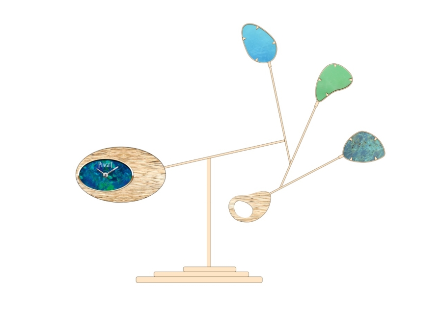เพื่อการสร้างสรรค์ที่ทลายขนบสู่ความล้ำสมัย Piaget จึงได้มอบหมายให้ Alex Palenski ศิลปินชาวฝรั่งเศสผู้เชี่ยวชาญในงานประติมากรรมเคลื่อนไหว และยังเป็นสหายของเมซง มารับหน้าที่ในการออกแบบและผลิตผลงานชิ้นดังกล่าว โดยนาฬิกาตั้งโต๊ะนี้ประกอบด้วยหน้าปัดโอปอลสีดำขนาดใหญ่รูปทรงรีแนวนอน ประดับด้วยทองที่ตกแต่งในลวดลาย Decor Palace พร้อมด้วยกิ่งก้านของโครงสร้างโมบายที่แผ่ขยายออก ซึ่งแต่ละกิ่งประดับด้วยหินล้ำค่าที่มีรูปร่างตามธรรมชาติในเฉดสีน้ำเงินและเขียว เพื่อให้สะท้อนแสงวาบของโอปอลสีดำ
