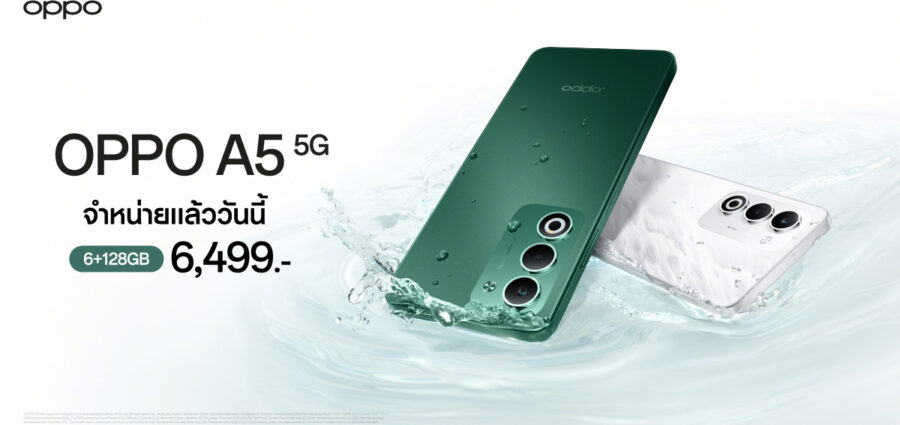 OPPO A5 5G สวย ครบ จบทุกดาเมจ มาพร้อมชิปเซ็ต MediaTek Dimensity 6300 5G ใช้งานได้ไหลลื่น เต็มประสิทธิภาพ ลุยไปกับคุณได้ตลอดวันด้วยแบตเตอรี่ใหญ่ที่สุดในราคาระดับเดียวกัน ใช้งานครบจบทุกเรื่องในเครื่องเดียวด้วยแบตเตอรี่ขนาดใหญ่ 6,000mAh และชาร์จไว 45W SUPERVOOC ไม่หวั่นทุกสถานการณ์ด้วยความทนทานมาตรฐานกันน้ำกันฝุ่น IP65 พร้อมต้านทานทุกแรงกระแทกระดับมาตรฐานการทหาร หายห่วงทุกการใช้งาน มาพร้อมความจุใหม่ RAM และ ROM 6GB + 128GB วางจำหน่ายใน 2 สี สีเขียว Aurora Green และ สีขาว Mist White ในราคาสุดคุ้มเพียง 6,499 บาท ที่ OPPO Brand Shop ทุกสาขาและตัวแทนจำหน่ายทั่วประเทศ