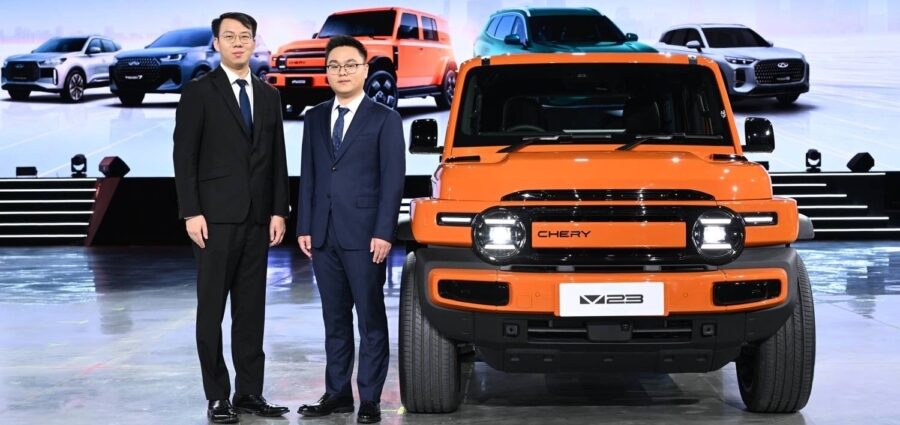 - V23: เอสยูวีพลังงานไฟฟ้า 100% โดดเด่นด้วยดีไซน์ทรงกล่องสไตล์เรโทร (Boxy Design) ที่สะท้อนตัวตนของคนเมืองยุคใหม่ พร้อมพื้นที่ใช้สอยที่ปรับเปลี่ยนได้หลากหลายและเทคโนโลยีเพื่อการขับขี่ที่สนุกสนาน โดย CHERY V23 มีให้เลือก 3 รุ่น ได้แก่ CHERY V23 2WD PLAY และ CHERY V23 2WD PLUS ติดตั้งแบตเตอรี่ขนาด 93 กิโลวัตต์ ให้กำลังสูงสุด 136 แรงม้า และแรงบิดสูงสุด 180 นิวตันเมตร ระยะการขับสูงสุด 360 กิโลเมตร/ชาร์จ (มาตรฐาน NEDC) ให้อัตราเร่งจาก 0-100 กม./ชม. ใน 11 วินาที และให้ความเร็วสูงสุด 140 กม./ชม. ราคา V23 2WD PLAY: 699,900 บาท / V23 2 WD PLUS: 759,900 บาท
