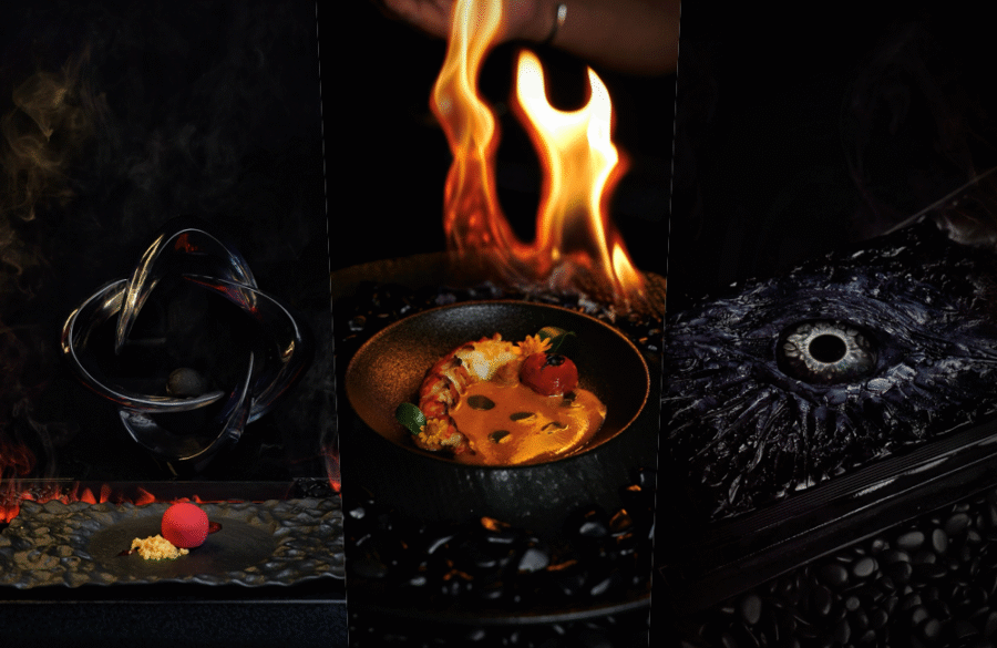 สำหรับ Ritual of Shadows คือการเดินทางที่เริ่มต้นด้วย Floating Black Moon และ Yuzu Infusion เปรียบเหมือนก้าวแรกสู่โลกมืด ก่อนพาไปพบกับเมนูสุดตื่นตาอย่าง Ocean & Earth Harmony, Eye of the Dragon, Kuro Kani Obsidian จนถึงเมนคอร์สที่ลูกค้าเลือกได้ระหว่าง Japanese A5 Wagyu, Australian Lamb Ribs หรือ Canadian Lobster และปิดท้ายด้วย Dessert Trilogy ที่ทั้งงดงามและลึกลับในคราวเดียว