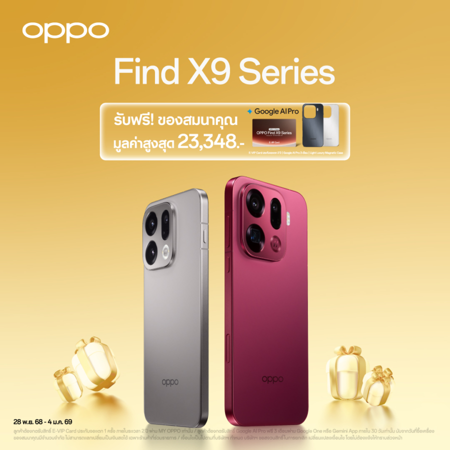 สัมผัสประสบการณ์ซูมดีทุกคอนเสิร์ตด้วยกล้อง 200MP Hasselblad Telephoto จาก OPPO Find X9 Pro มอบภาพถ่ายคมชัดทุกรายละเอียด แม้ครอปภาพก็ยังคงความคมชัดเหนือระดับ และในรุ่น OPPO Find X9 Pro และ OPPO Find X9 มาพร้อมพลังซูมไกล 120x Super Zoom และการบันทึกวิดีโอความละเอียดสูงระดับ 4K 120fps มาพร้อม Stage Mode ที่รองรับทั้งการถ่ายภาพและวิดีโอให้เก็บทุกอารมณ์และจังหวะของศิลปินได้อย่างสมบูรณ์แบบ มาพร้อมสีใหม่ “Velvet Red” สีแดงสุดพรีเมียม โดยเมื่อซื้อ OPPO Find X9 Pro และ OPPO Find X9 รับฟรี E-VIP Card ประกันจอแตก 1 ครั้ง ภายในระยะเวลา 2 ปี, ฟรี Google AI Pro 3 เดือน, Light Luxury Magnetic Case มูลค่ารวม 23,348 บาท และมูลค่ารวม 19,348 บาท ตามลำดับ