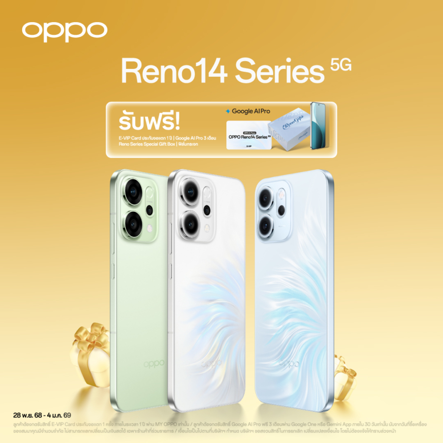 OPPO Reno14 Series 5G สมาร์ตโฟน The AI Portrait Expert ถ่ายพอร์ตเทรตสวยทุกโมเมนต์ มาพร้อมกล้องพอร์ตเทรตซูมได้ 3.5 เท่า อีกทั้งยังมาพร้อม AI Flash Photography ที่ช่วยให้การถ่ายภาพพอร์ตเทรตในสภาพแสงน้อยมีคุณภาพสูงขึ้นอย่างเห็นได้ชัด มอบรายละเอียดผิวชัดเจน สีผิวมีความนุ่มนวลคงความเป็นธรรมชาติ และยังให้อารมณ์ของภาพสุดชิคแบบ Y2K เทรนด์สุดฮิตของเหล่าวัยรุ่น โดยเมื่อซื้อ OPPO Reno14 Pro 5G รับฟรี E-VIP Card ประกันจอแตก 1 ครั้ง ภายในระยะเวลา 1 ปี, ฟรี Google AI Pro 3 เดือน, Reno Series Special Gift Box, ฟิล์มกระจก มูลค่ารวม 14,148 บาท และ เมื่อซื้อ OPPO Reno14 5G รับฟรี E-VIP Card ประกันจอแตก 1 ครั้ง ภายในระยะเวลา 1 ปี, ฟรี Google AI Pro 3 เดือน, Reno Series Special Gift Box, ฟิล์มกระจก มูลค่ารวม 11,148 บาท และเมื่อซื้อ OPPO Reno14 F 5G รับฟรี E-VIP Card ประกันจอแตก 1 ครั้ง ภายในระยะเวลา 1 ปี, Reno Series Special Gift Box, ฟิล์มกระจก มูลค่ารวม 6,898 บาท