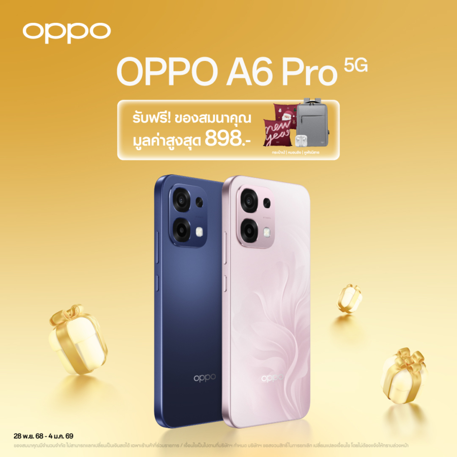 OPPO A6 Series สมาร์ตโฟนจากตระกูลซีรีส์ A สมาร์ตโฟนที่ตอบโจทย์ทุกความต้องการของผู้ใช้งาน สมูทเกินต้าน ทนทานทุกดาเมจ มาในรุ่น OPPO A6 Pro 5G ที่กันน้ำกันฝุ่นระดับ IP69 มอบประสบการณ์ทนทานทุกดาเมจ มาพร้อมความทนทานระดับมาตรฐานการทหาร หายห่วงทุกการใช้งาน โดยเมื่อซื้อ OPPO A6 Pro 5G รับฟรีกระเป๋าเป้ และหมอนอิง มูลค่า 898 บาท