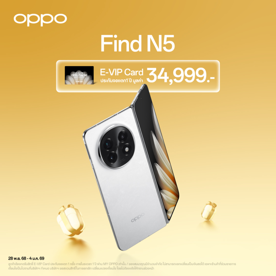 OPPO Find N5 พร้อมมอบประสบการณ์นิยามใหม่ของความบาง ดื่มด่ำประสบการณ์ใช้งานได้เต็มอรรถรส พร้อมยกระดับการถ่ายภาพไปอีกขั้นด้วยโหมด Hasselblad Portrait ด้วยกล้อง Telephoto มาพร้อมประสิทธิภาพการทำงานระดับ PC มัลติทาสกิ้งอย่างลื่นไหลด้วย Boundless View จัดการงานหลายอย่างได้พร้อมกันสูงสุด 3 แอปฯ และเชื่อมต่อ Mac ได้ โดยเมื่อซื้อ OPPO Find N5 รับฟรี E-VIP Card ประกันจอแตก 1 ครั้ง ภายในระยะเวลา 1 ปี มูลค่า 34,999 บาท