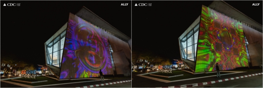 การแสดง Projection Mapping บนอาคาร SCG Home Experience ถ่ายทอดจังหวะของลมหายใจผ่านแสงและการเคลื่อนไหว โดย TIDMA เครือข่ายศิลปินกว่า 10 สตูดิโอ ร่วมกับศิลปินและนักศึกษาจาก 3 มหาวิทยาลัยชั้นนำ